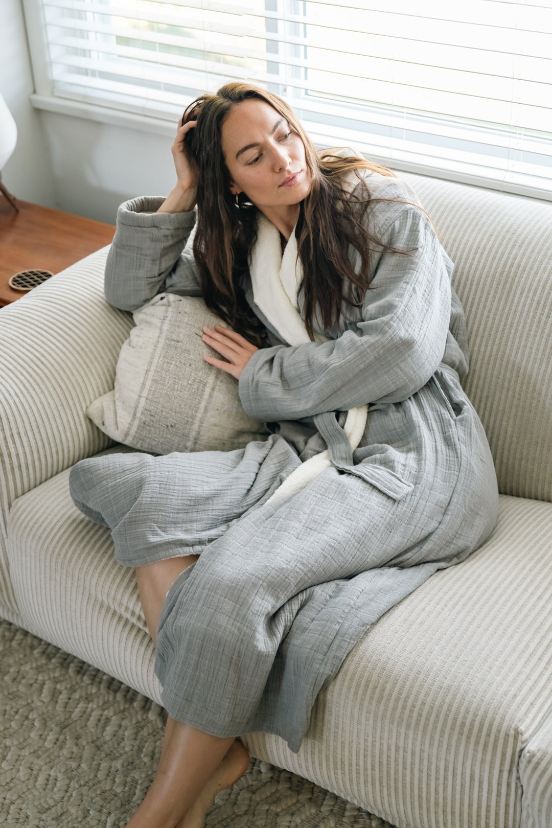 The silky soft texture of the fleece offers a rich texture against the skin, while being lightweight and warm. Perfect for mornings around the house, lounging or for aprés bath and pool. Â