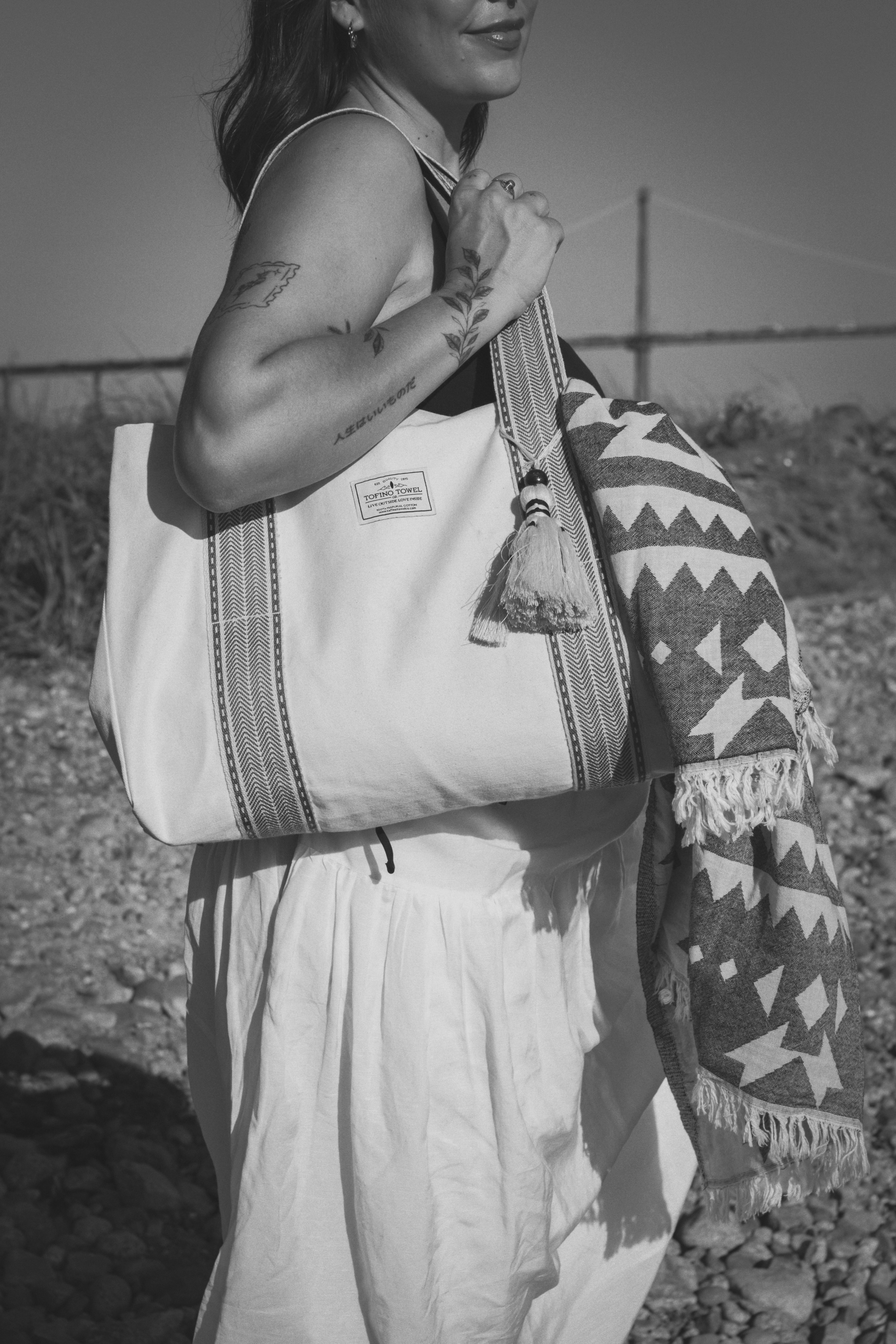 Meet The Orla Tassel tote. This playfully oversized tote blends utility with timeless style, featuring comfortable robust straps and an adorable tassel for an extra dash of personality. This tote's size can be adjusted with the snap of a button and the inner zip pocket keeps your keys and small essentials right where you need them. Handmade from 100% Turkish cotton, this bag is ready for beach days, market runs, weekend trips, or whatever life throws your way!
