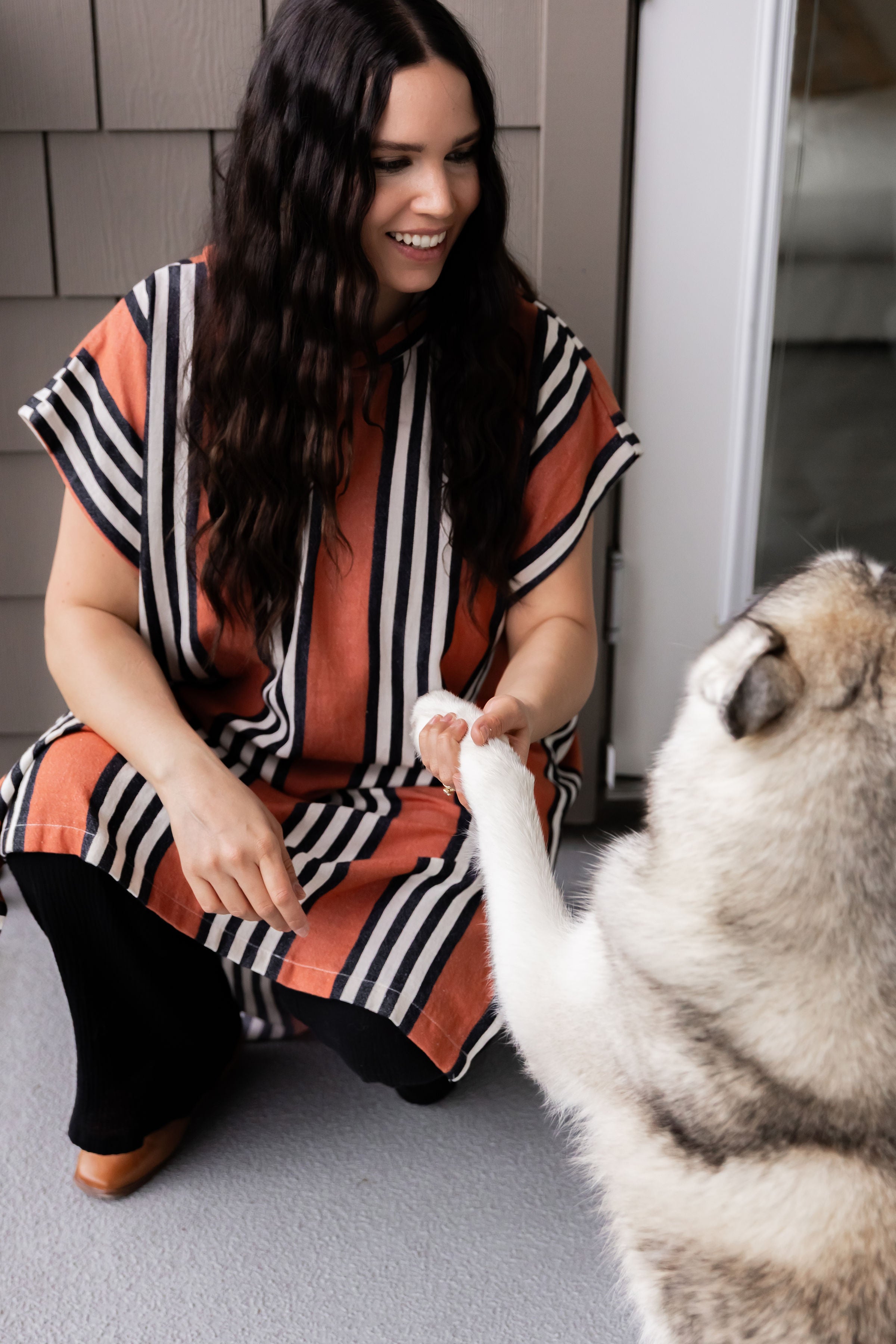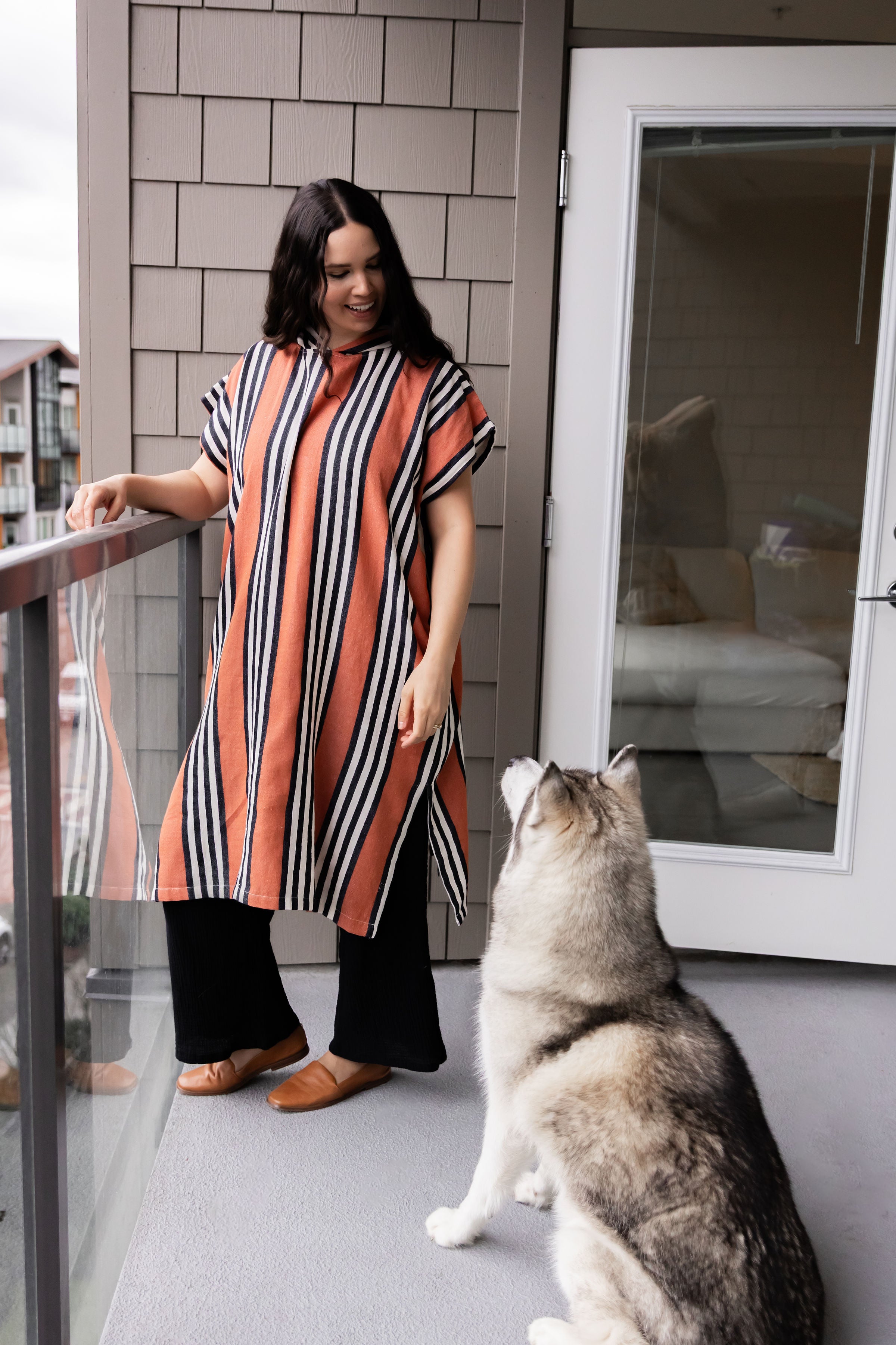 Throw on the Squall poncho and lean into that effortless beach vibe you've been waiting all year for. This modern striped poncho is a nod to retro charm, where dark orange, black, and white stripes create a bold style without trying too hard. Lightweight and breathable, this poncho is exceptionally absorbent and dries quickly, making it your go-to companion for carefree beach days. Pack it anywhere, slip it on anytime.