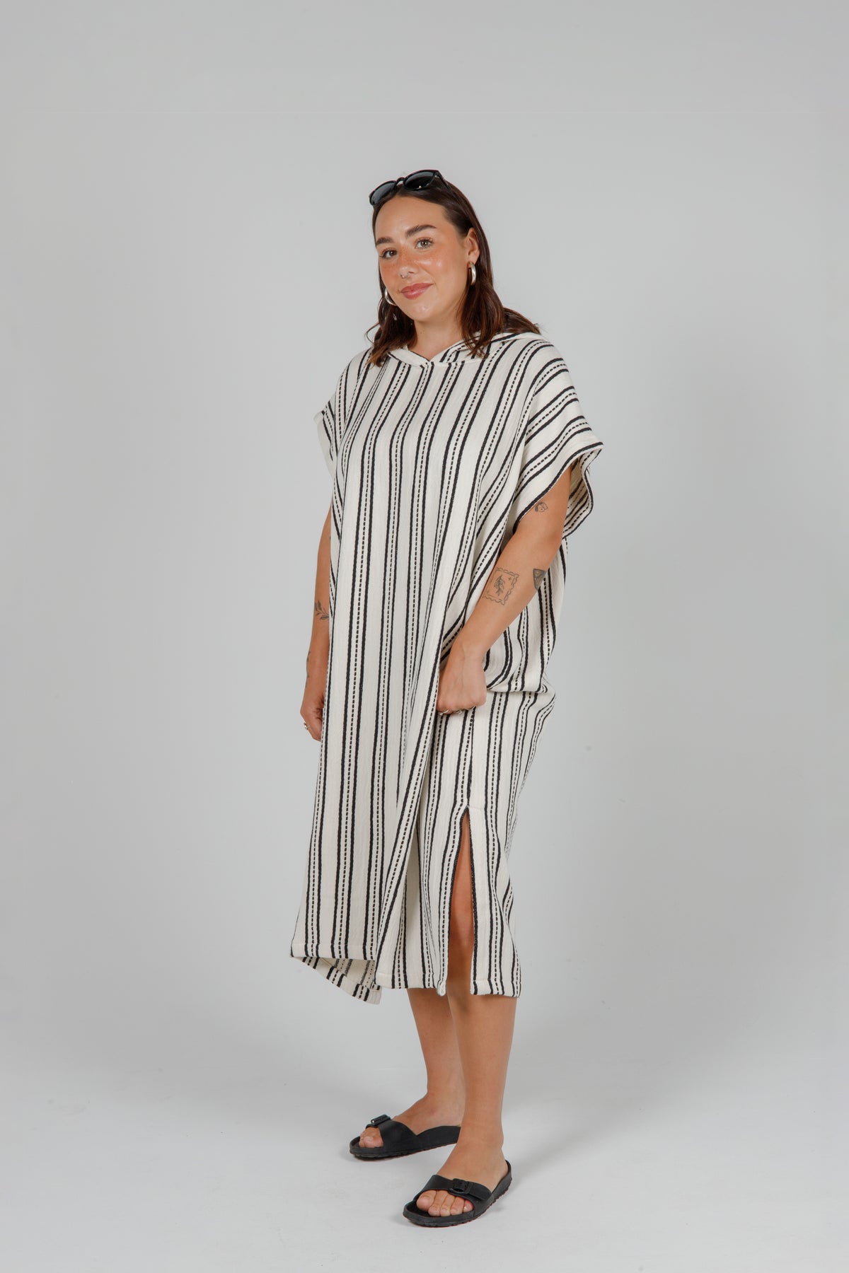 Woven from Turkish cotton, with hand-stitched black stripes this lightweight poncho will keep you feeling stylish and carefree no matter where your day takes you.