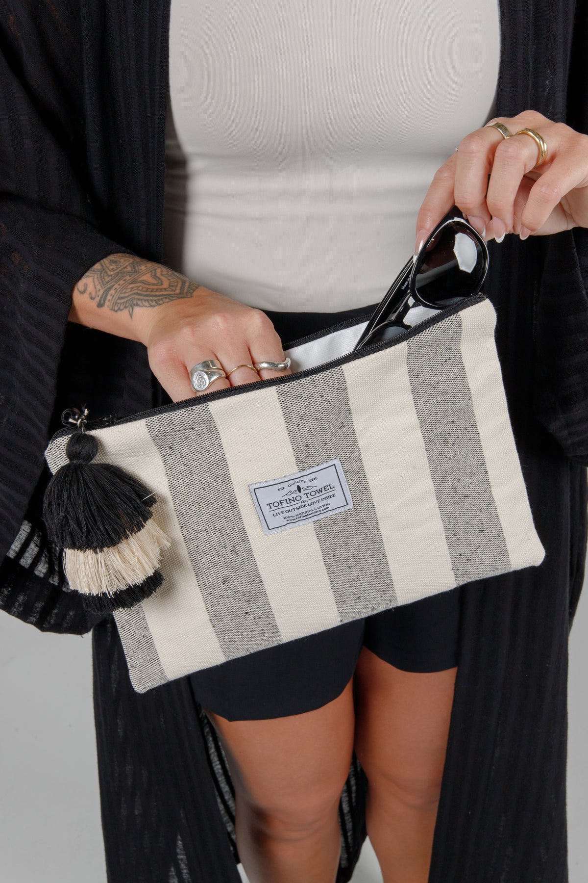 The Orla tassel pouch is the essential bag for your essentials that is equal parts practical and pretty. Featuring a water-resistant liner, a smooth zip closure, and an adorable tassel detail, this beauty showcases bold stripes that go with everything. Ideal for makeup, toiletries or even a wet bathing suit, this pouch is perfect for everyday use and is a must have when travelling.